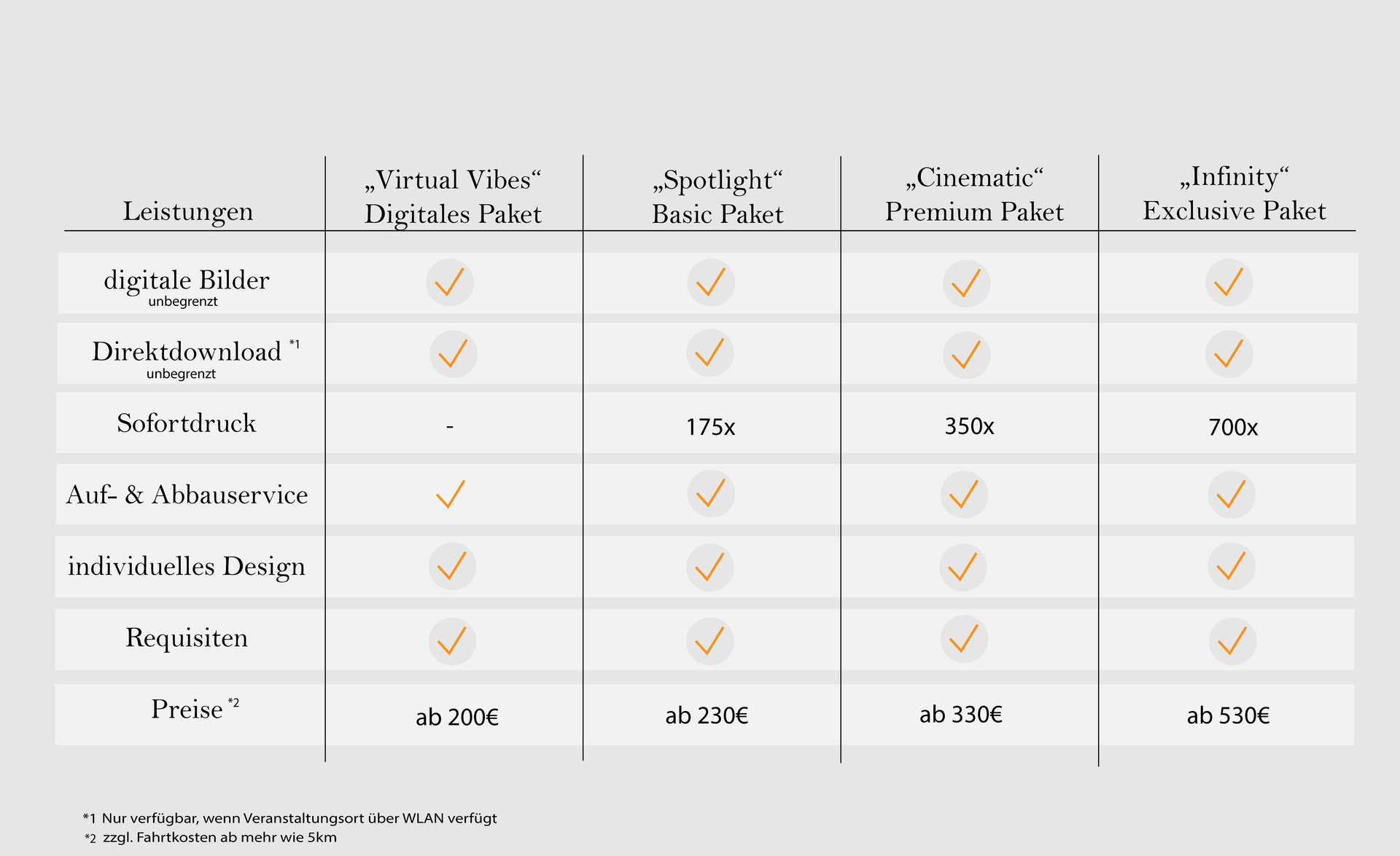 Unser Auf- und Abbauservice ist in allen Paketen mit inbegriffen. Sie müssen sich keine Sorgen um Anlieferung oder ähnliches machen. Sie genießen lediglich die Momente vor der Kamera!